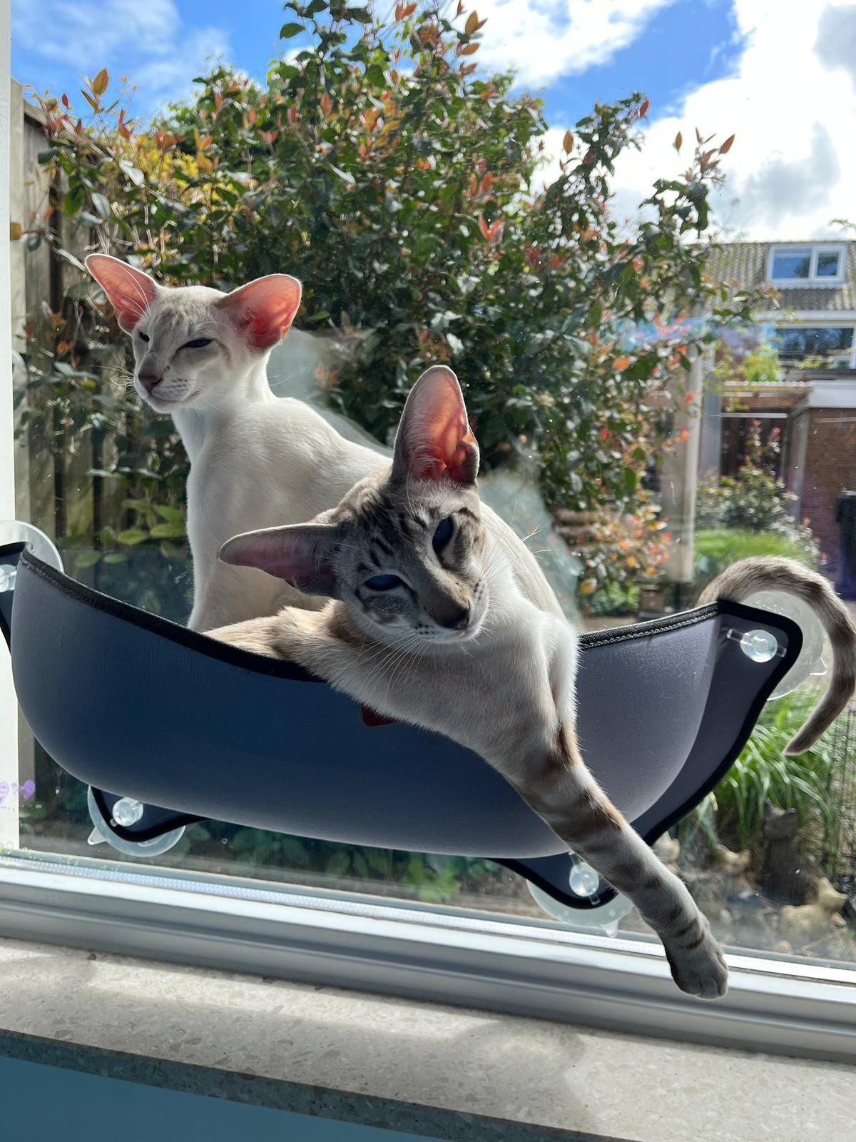 Wij hebben een tabby lilac point en een tabby seal point. Hun oren staan mooi omhoog en ze zijn enorm elegant met hun lange staart. Kortom we genieten elke dag enorm van ze.